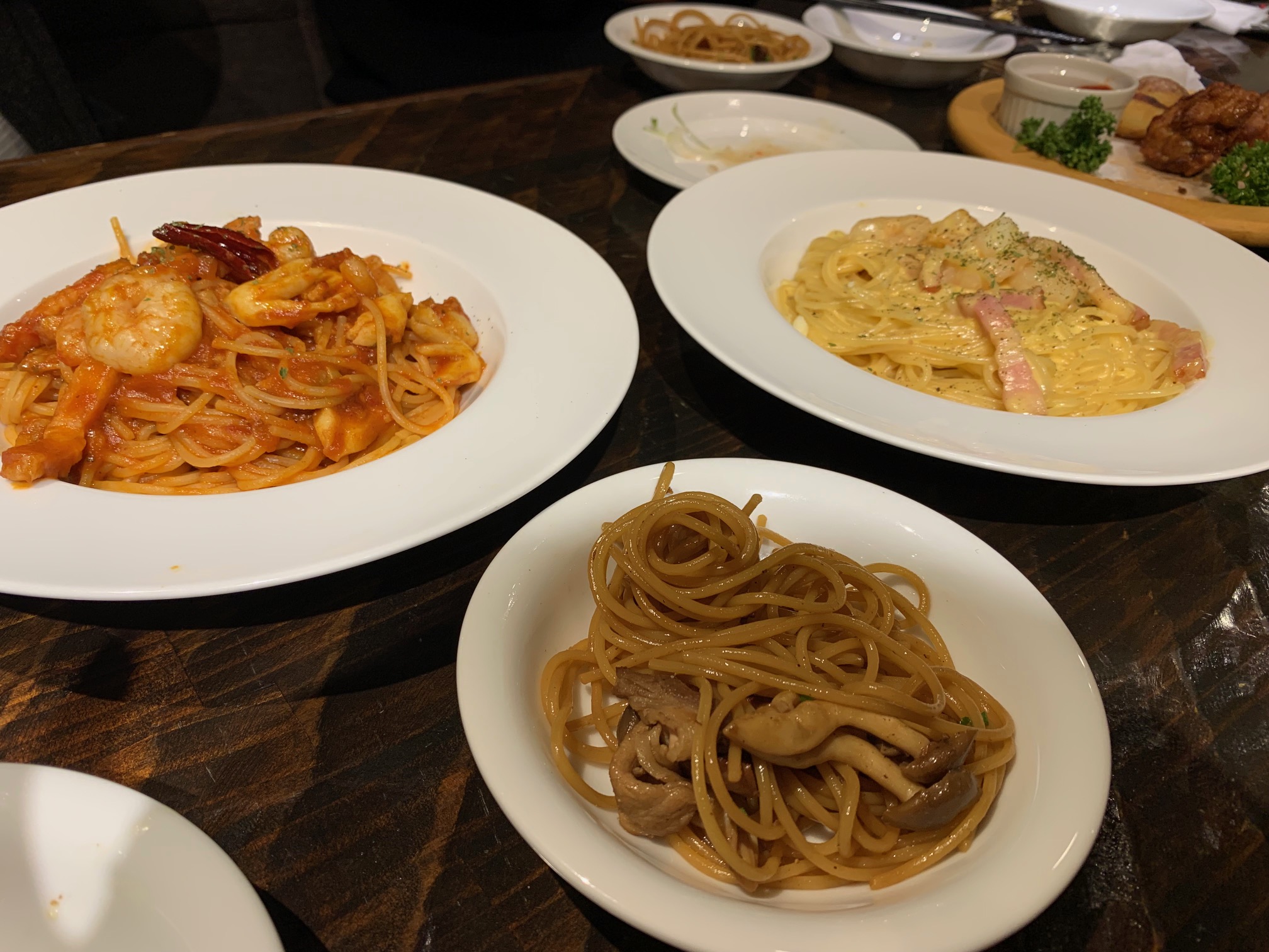 ペスカトーレ、カルボナーラ、キノコのパスタ3種はどれもとてもおいしく、