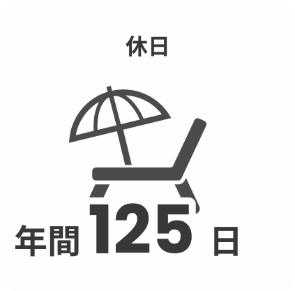 完全週休2日制(土・日)・祝日 【年間休日】125日 【有給休暇】10日 【休暇制度】 ・GW休暇 ・夏季休暇 ・年末年始休暇 ・慶弔休暇 ・育児休暇 |